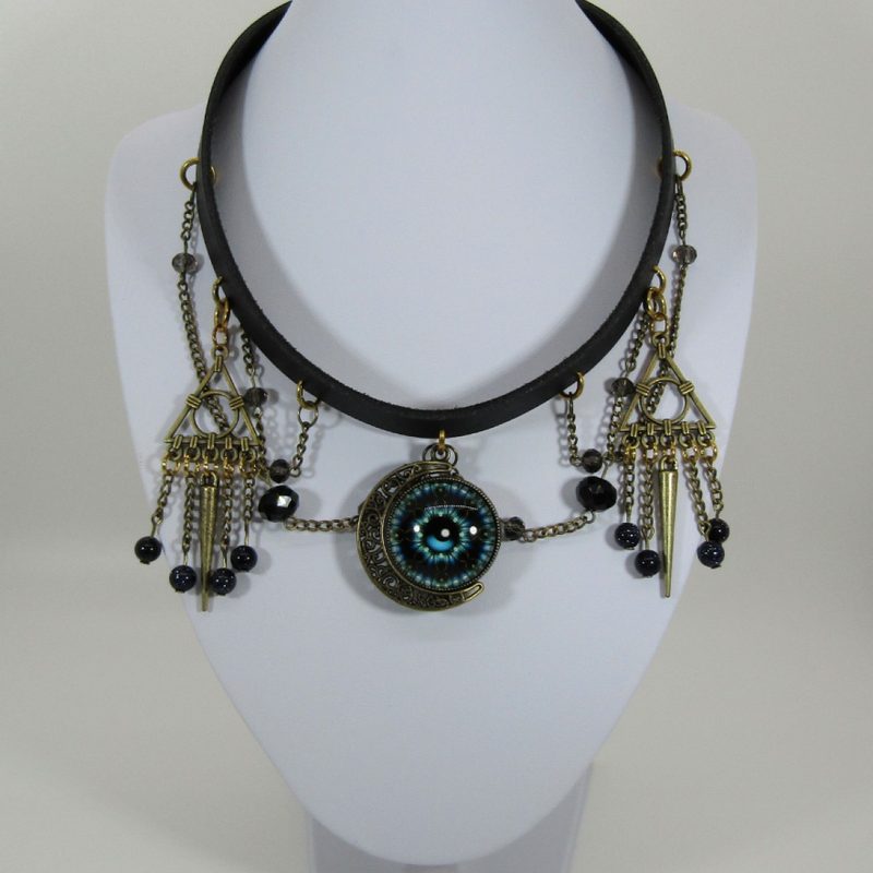 A leather choker featuring a double sided blue eye set in an Antique Gold moon tray, decorated with all-seeing eye antique gold charms, black and smokey gray briolette crystals, midnight blue goldstone beads and Antique Gold spikes. Finished with ribbon clamps and a Lobster clasp with added chain so that the wearer can adjust the length of the necklace to suit their style.