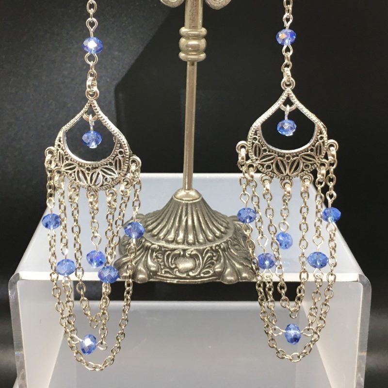 Tibetan style charm earrings finished with blue crystal faceted beads and silver chain.