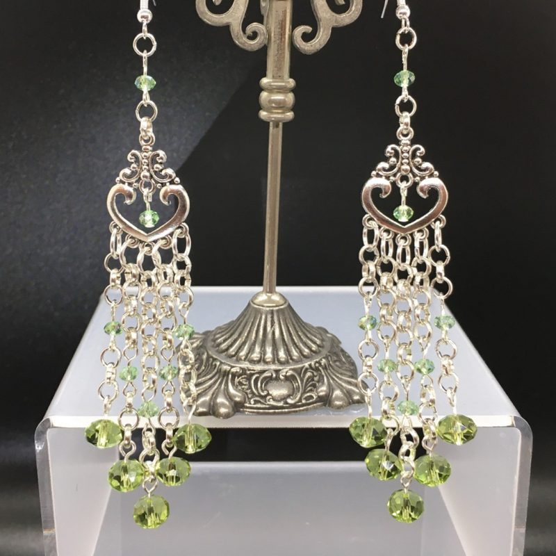 Tibetan style heart charm earrings finished with green crystal faceted beads and bright belcher chain.