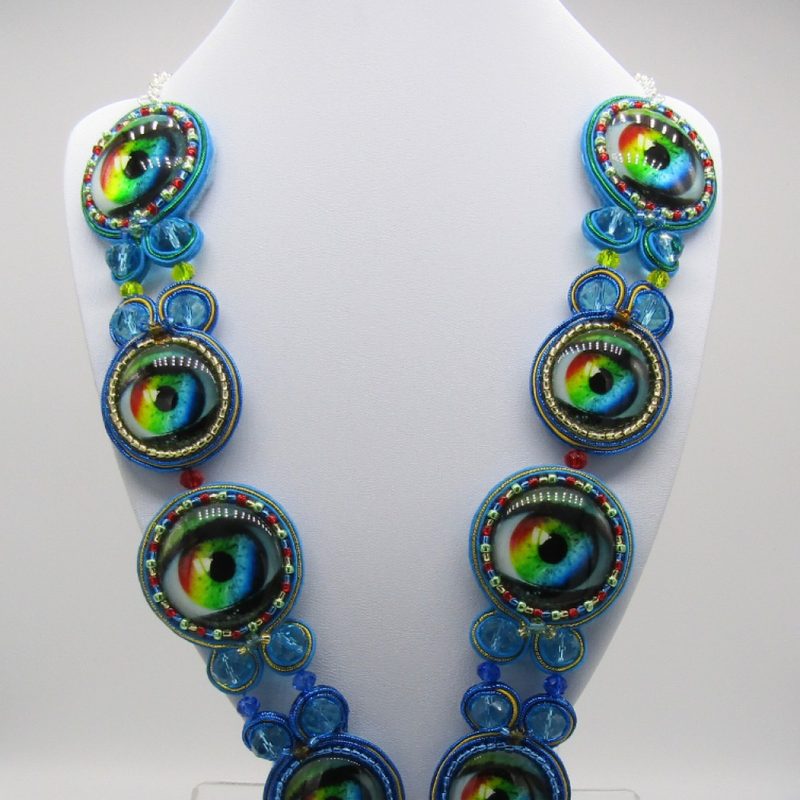 Light and Dark Blue, Metallic Gold and Metallic Green Soutache cord wrapped around stunning and vibrant rainbow eye cabochons accented with a turquoise blue chakra pendant. Decorated with rainbow coloured seed beads and blue briolette crystal beads, finished with silver belcher chain and lobster clasp.