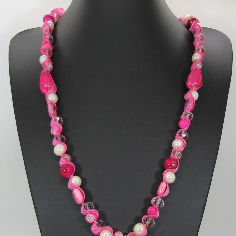 Pink Matte Ribbed ribbon necklace with pink crackle beads, pink and clear crystal faceted beads, pink and gold swirl beads and synthetic white pearls, decorated with a pointed Chakra style pink pendant. Finished with silver ribbon clamps and lobster clasp.