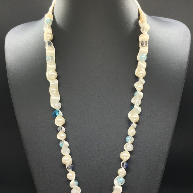 White Matte Ribbed Ribbon with snow white czech glass pearl beads, blue and clear crystal faceted beads, white crackle beads and crystal light blue beads, decorated with a large clear Swarovski Crystal pendant. Finished with silver ribbon clamps and lobster clasp.